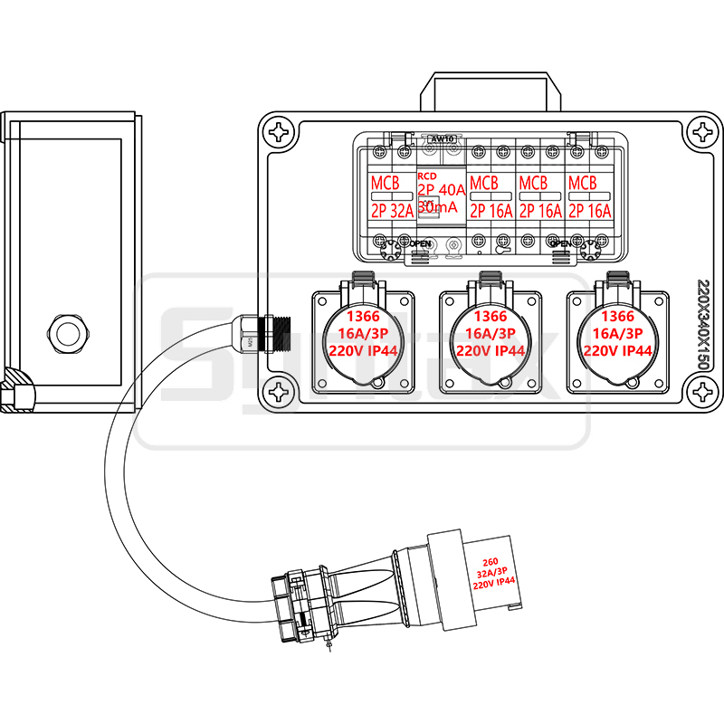 Die 32 AMP Einphasen-Wandverteilertafel für den Außenbereich besteht aus PC-Material, sie hat ein Verlängerungskabel 3C4mm2 1,5 m mit einem 3P 32A 220V Stecker, geschützt durch MCB+RCCB. Die Ausgangssteckdosen sind paneelmontierte gerade 3P 16A 220V IP44 Steckdosen, die durch 3 Stück 2P 16A MCBs geschützt sind. Alle Stromverteilertafeln werden auf Bestellung gefertigt.