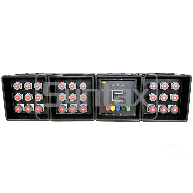 Diese tragbare 3PH 200 Ampere Event-Box für den Außenbereich ist speziell für temporäre Bühnenstromkästen konzipiert. Der Eingangssatz von 5 Camlock-Anschlüssen ist durch einen 4P 200A Schneider MCCB geschützt. Die Ausgangssteckdosen sind 3 Stück 5P 63A 400V IP67 Steckdosen und 6 Stück 5P 32A 400V IP67 Steckdosen ohne Schutz. Der Kunde hat die Marke der Industriestecker und -steckdosen von Mennekes und alle Schutzschalter von Schneider angegeben. Die Boxen werden aus HDPE hergestellt und sind IP67 wasserdicht, was perfekt für Veranstaltungen, insbesondere für Bühnen, ist. Wir können kundenspezifische Stromverteilerkästen nach Bestellung bauen.