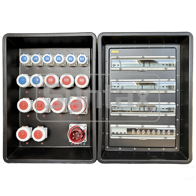 | Ausgänge 15-16 | 2 × 5P 63A 400V IP67 Paneelmontage-Steckdosen, geschützt durch 2 × 4P 63A MCBs + 2 × ELRs, mit 2 × Kippschaltern |