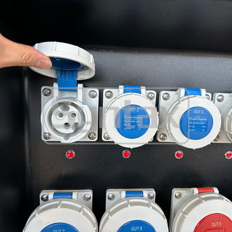 | Ausgänge 1-6 | 6 × 3P 16A 220V IP67 Paneelmontage-Steckdosen, geschützt durch 6 × 1P+N 16A 30mA RCBOs |